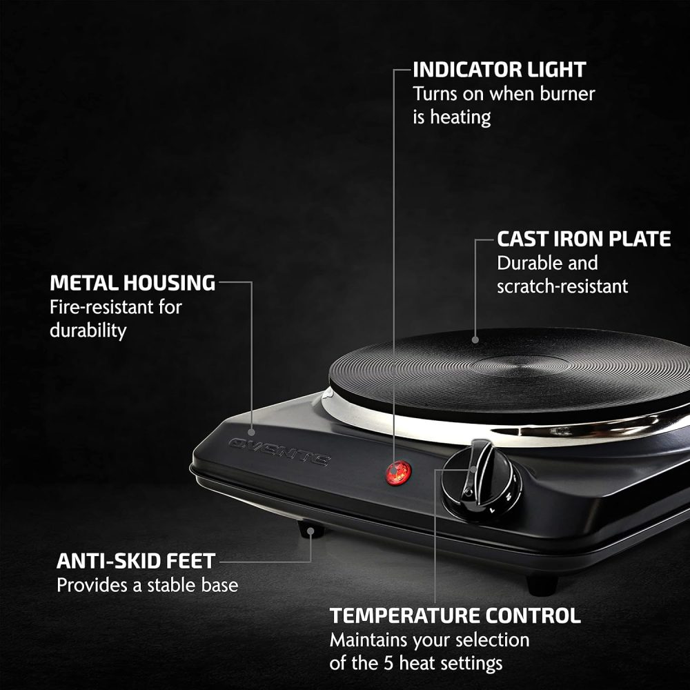 OVENTE Electric Countertop Single Burner, 1000W Cooktop with 7.25 Inch Cast Iron Hot Plate, 5 Level Temperature Control, Compact Cooking Stove and Easy to Clean Stainless Steel Base, Black BGS101B